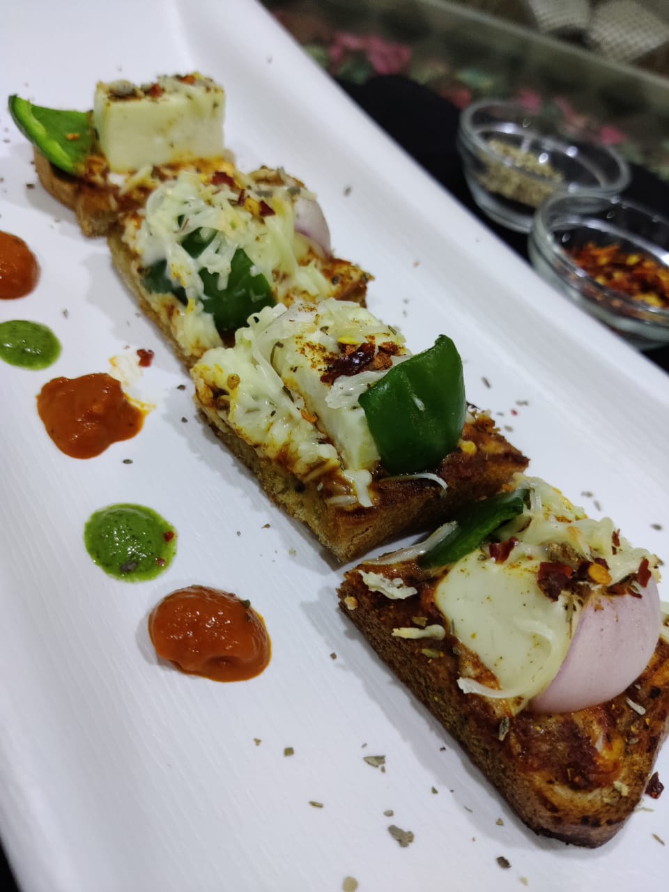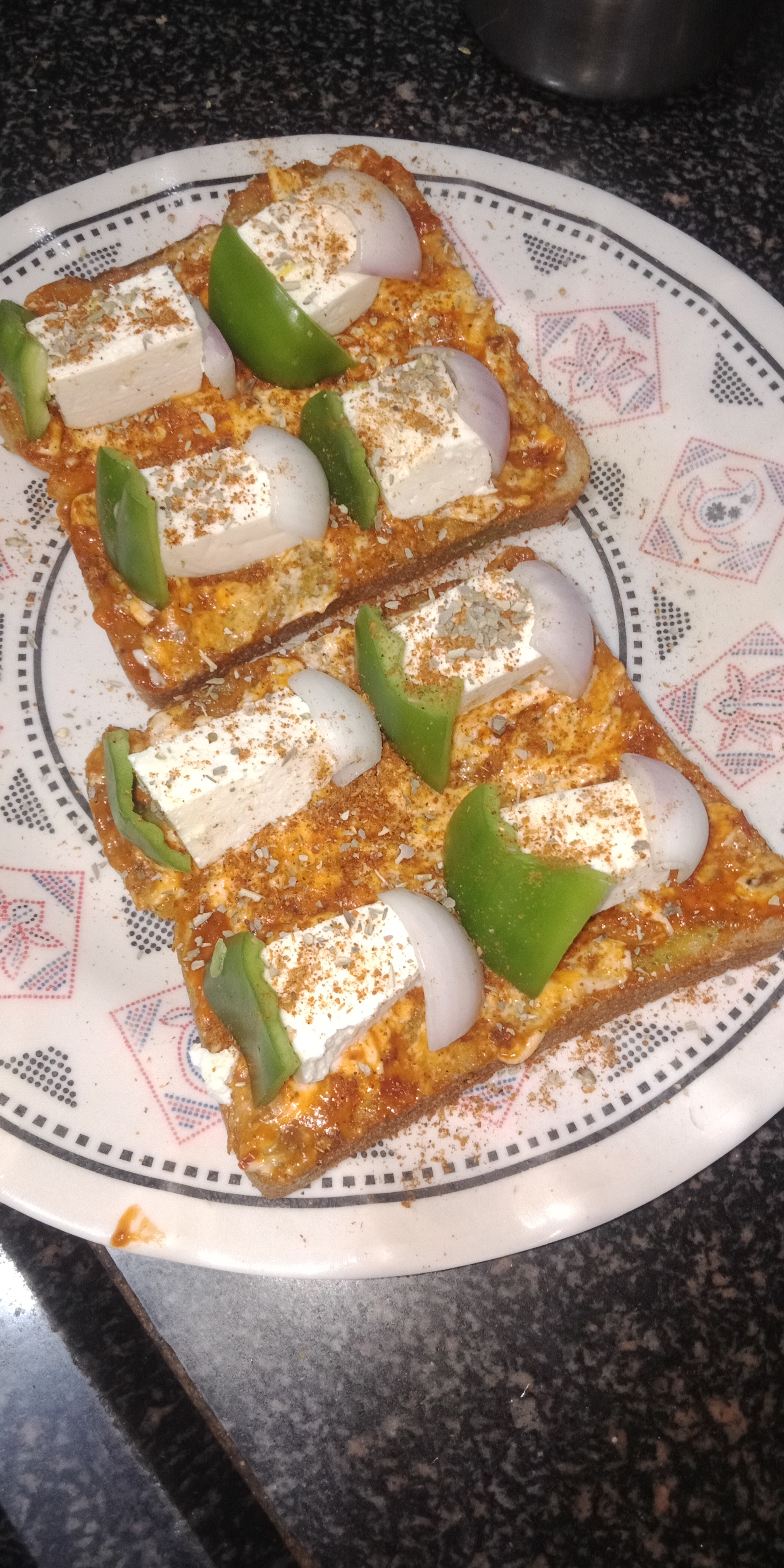2.Then sprinkle the tandoori masala and keep the Panner, onion and capsicum on the bread and then sprinkle chilli flakes, oregano and tandoori masala.And add grated cheese.Then Bake for 8-10mins at 200degree.And it's ready enjoy.